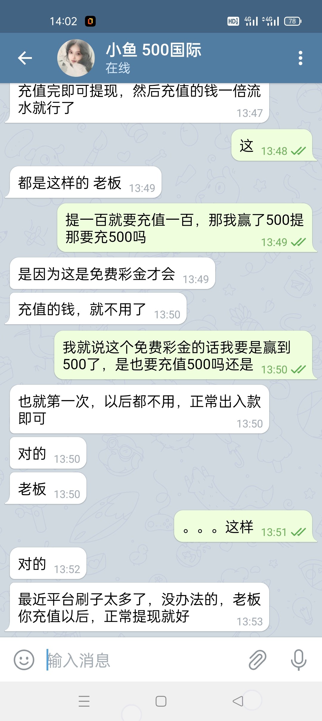 黑台子,群里全是托,一天就那几个人在哪里晒图,吹牛,赢到了叫你充值,赢多少充多少,诈骗台