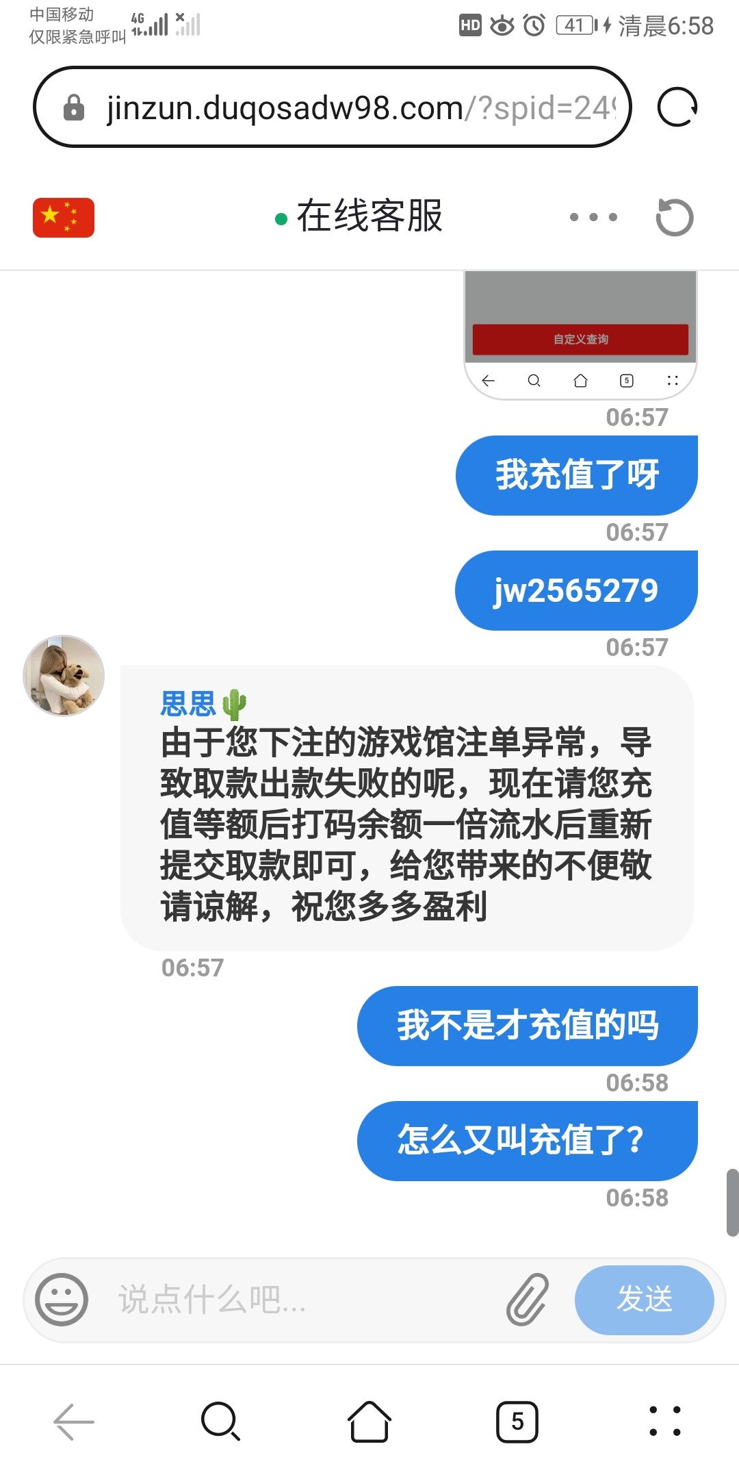 签到彩金打到108提现,叫我充值,充值了50,流水打了一倍,我充值了50提100,提现的时候又说我注单异常又叫我充值同等金额,真的是草了