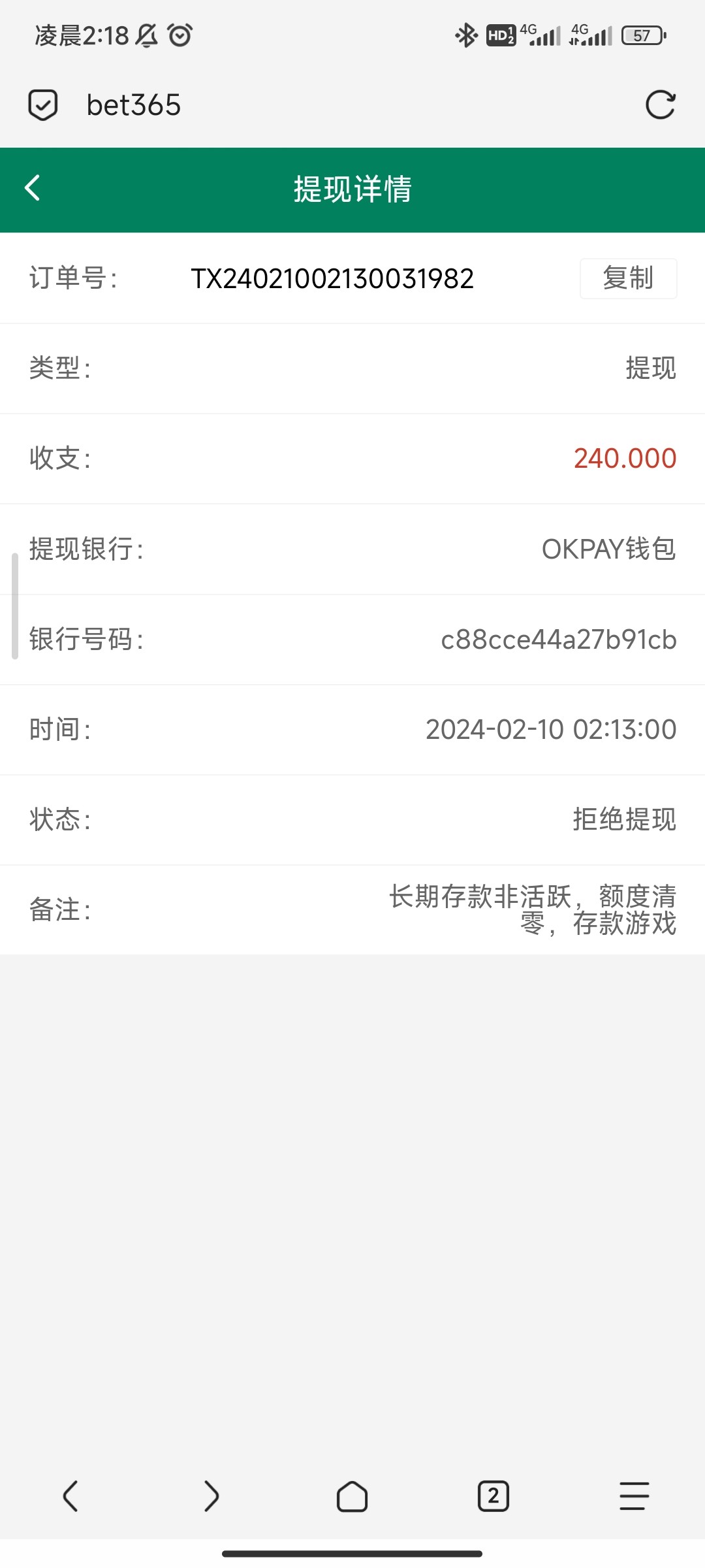 662回馈24打到1300故意输剩600,提现已拒绝到账,理由是彩金套利,账号没封,太好了又白嫖600。