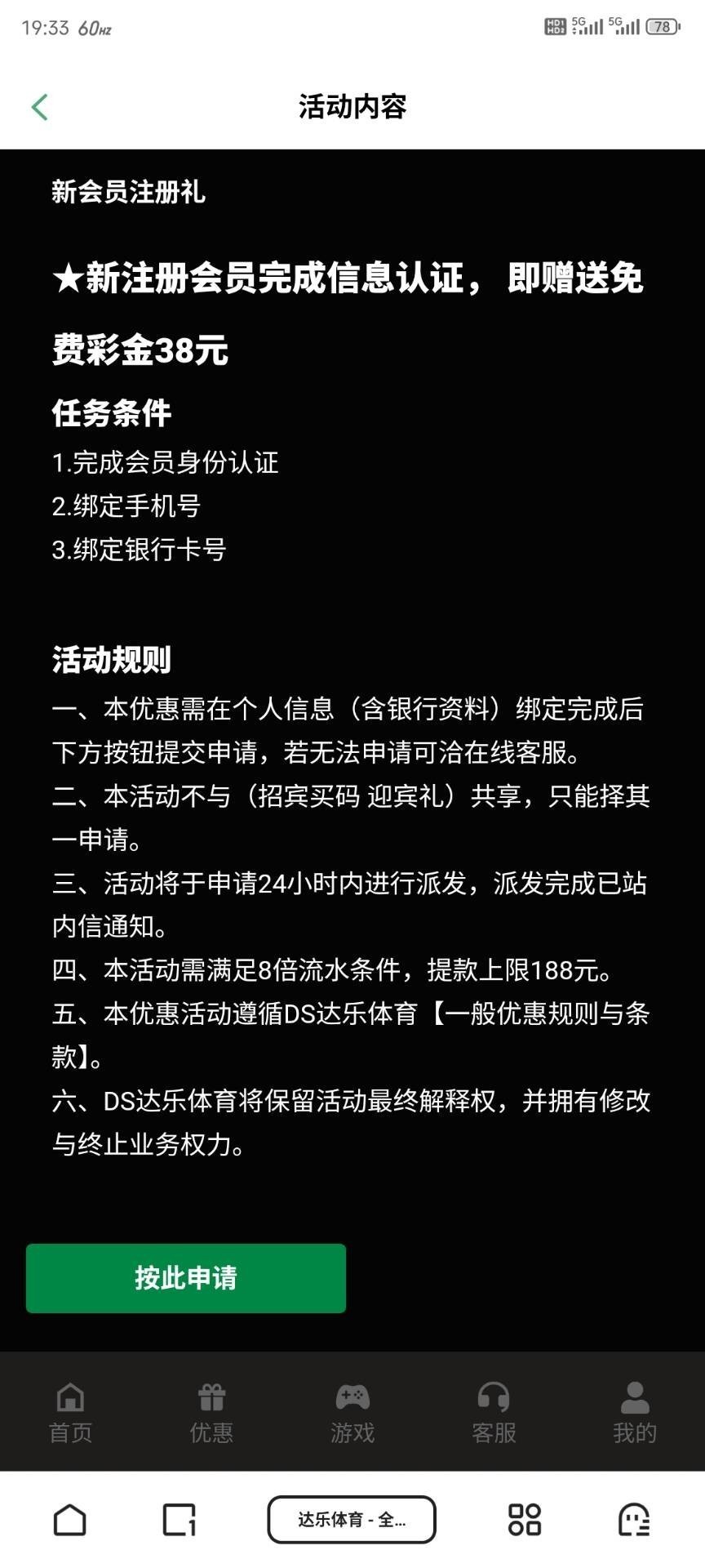 新用户下载APP注册绑卡绑定手机号优惠大厅自助提交申请38/100提,8水提款上限188