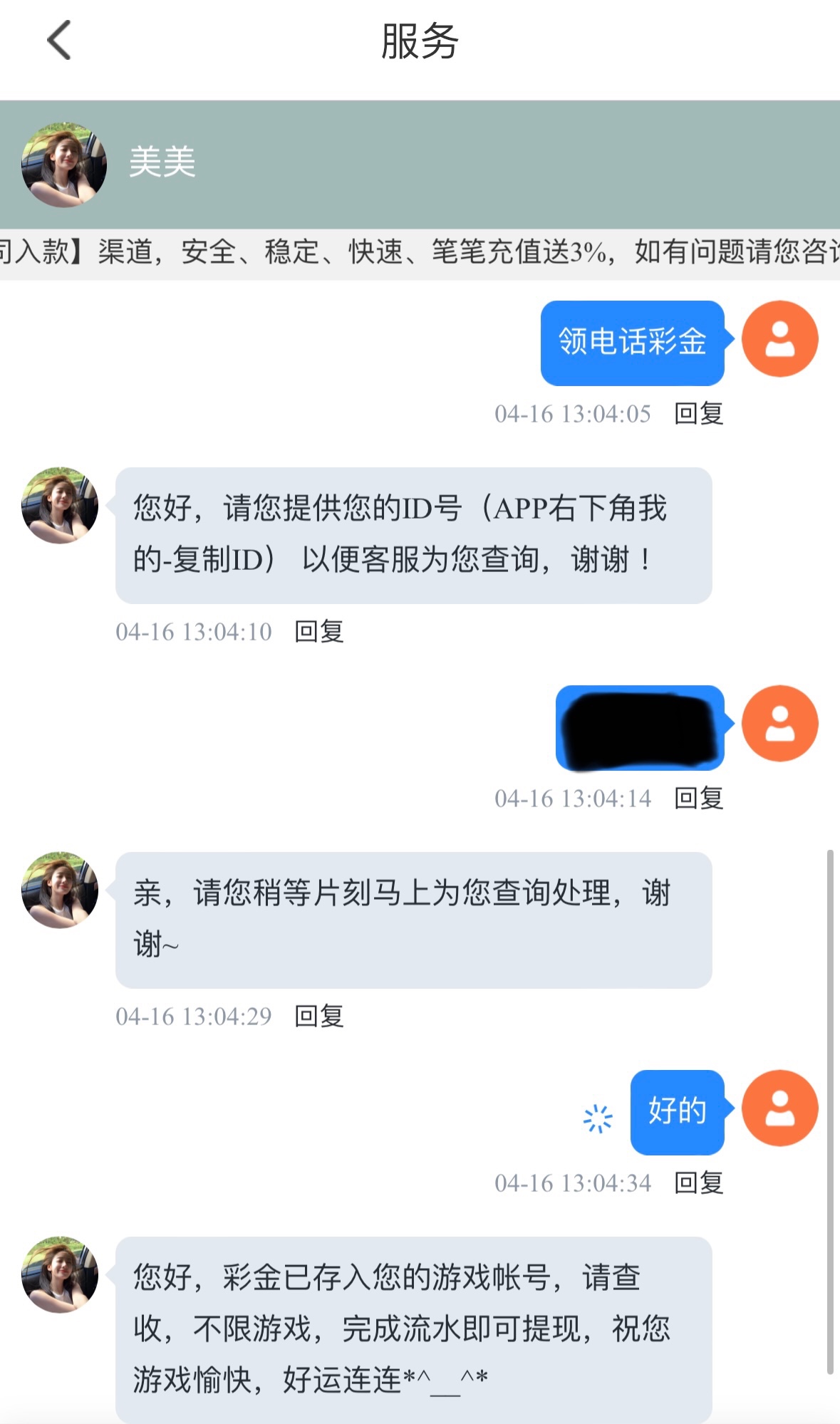 之前送过回访彩金的兄可以去领8回访彩金联系在线客服送领电话彩金发ID查就行了