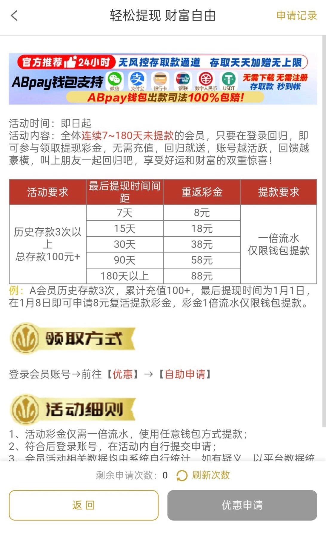 存款3次以上总存款100以上,7天以上没提现过才有彩金领,符合的兄弟可以去领取一下