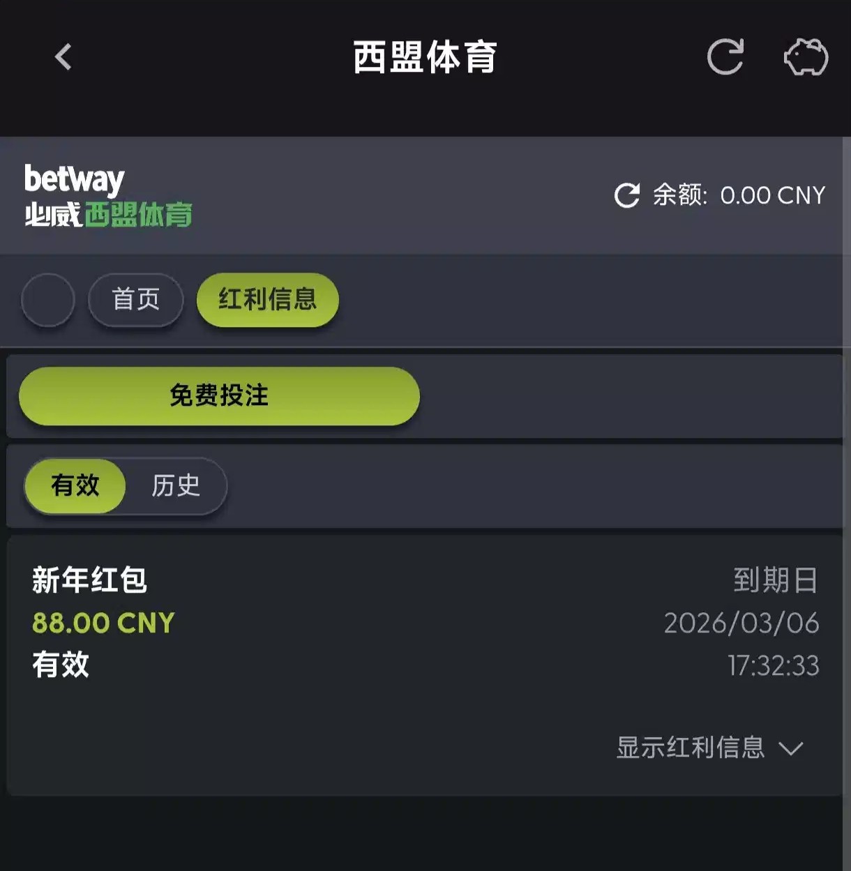 这个平台的老玩家可以登入上看一下有没有别过期了,有这个彩金只能玩西盟体育,不用领取点进西盟体育里面就有了,只能下注中奖了只得中奖金额然后送的彩金扣除