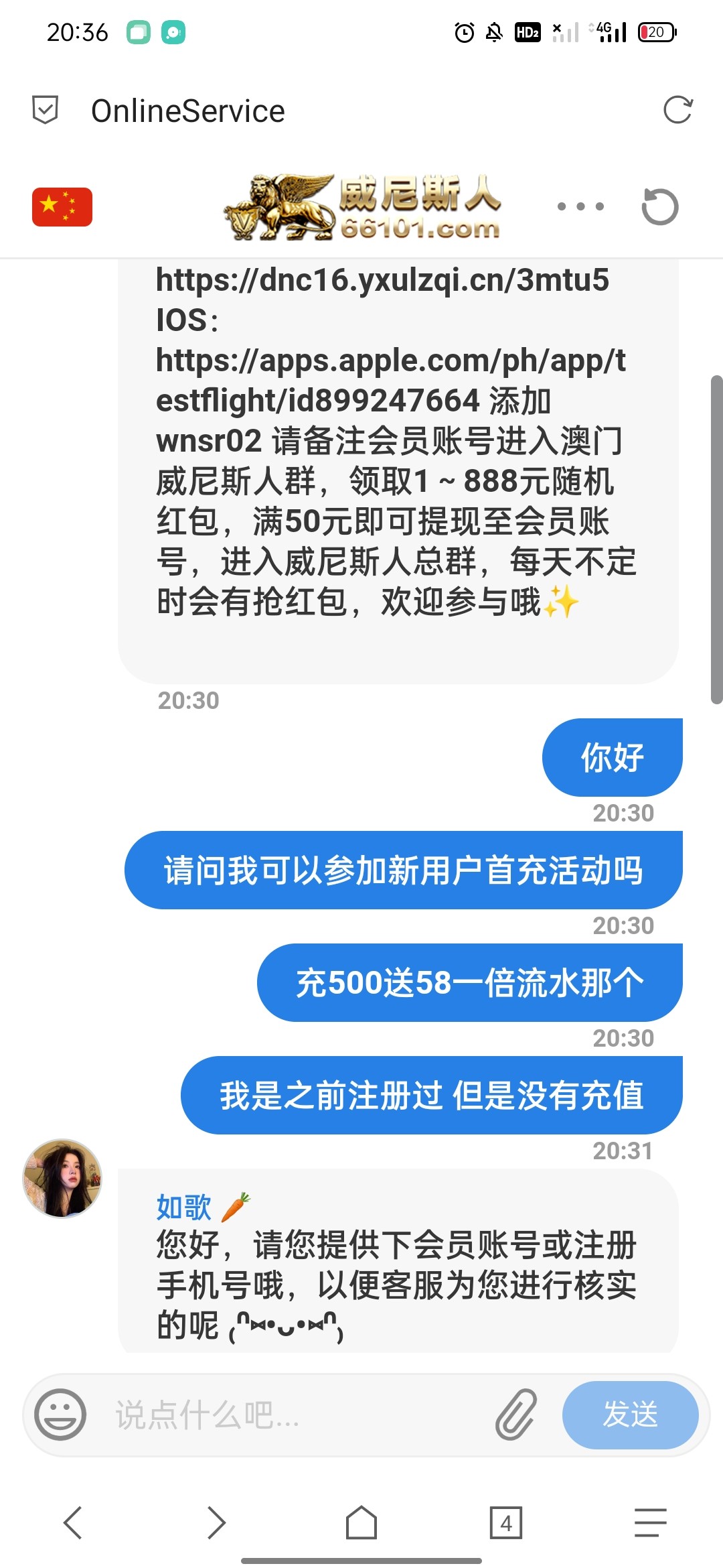 第一天8.8 找狗聊客服送18.8 不知道明天还送不送