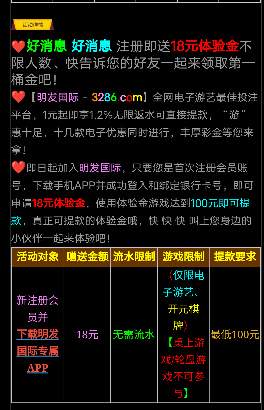 新注册会员并下载明发国际专属APP,活动优惠自助申请18元彩金,(仅限电子游艺、开元棋牌)【桌上游戏/轮盘游戏不可参与】最低一百元提现。