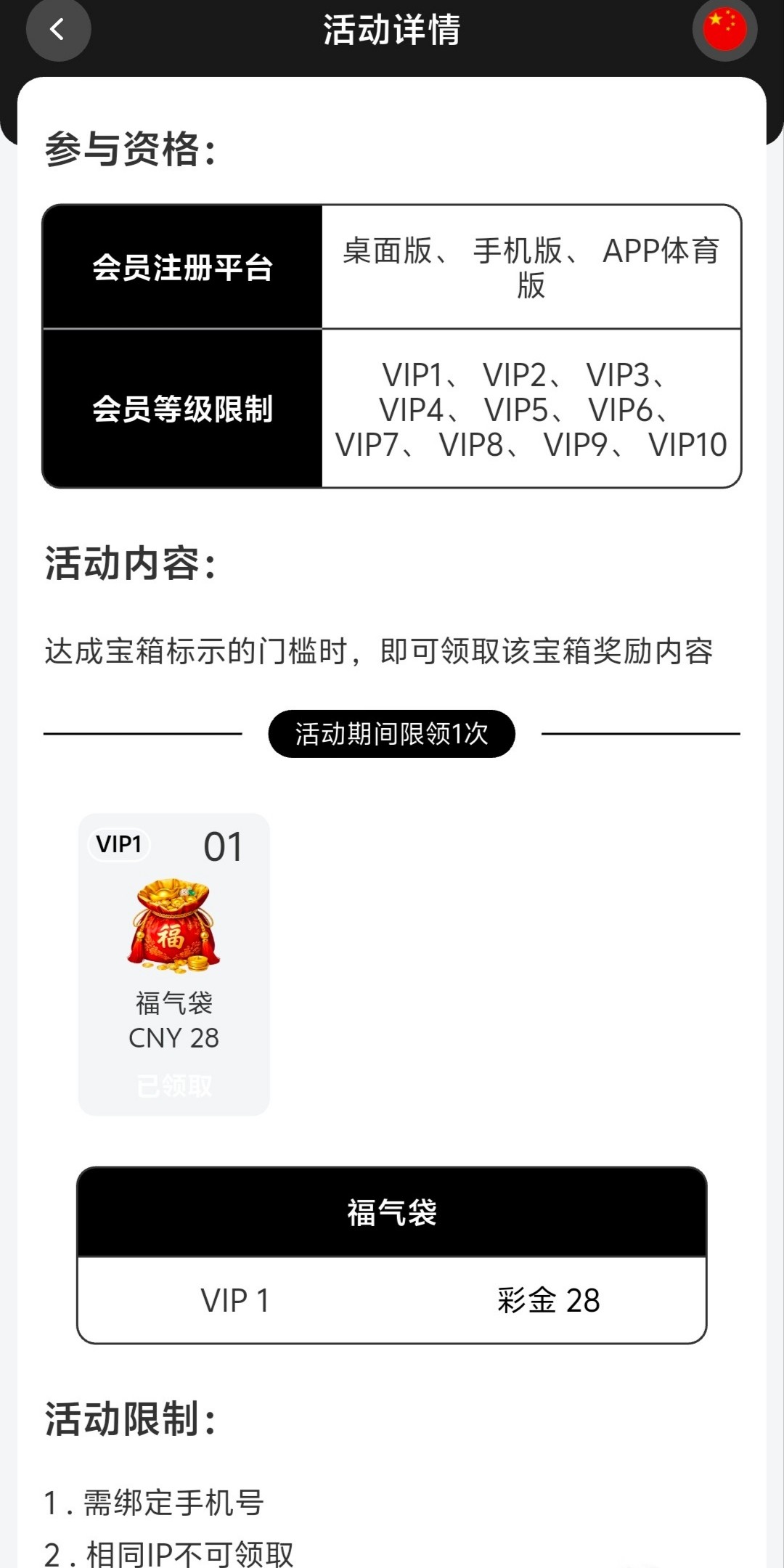 有VIP等级最低VIP1才能领取彩金,要绑定手机号/相同IP领取过就不能领取了,符合可以领取看一下